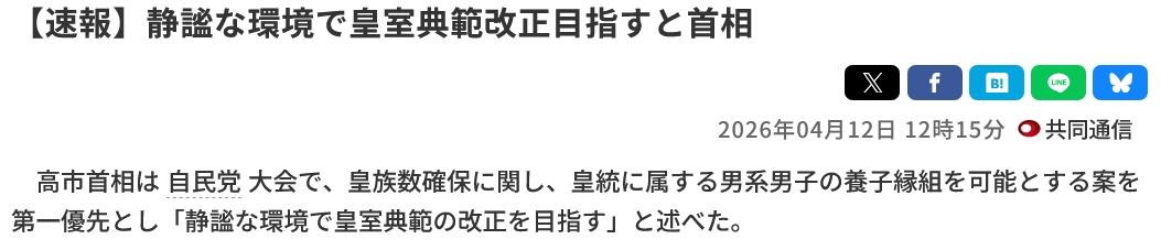 また、皇室典範についても「皇族数の確保を図ることが喫緊の課題」として、「国会における議論を主導」し、「皇室典範の改正を行うことを目指す」とうったえます。
