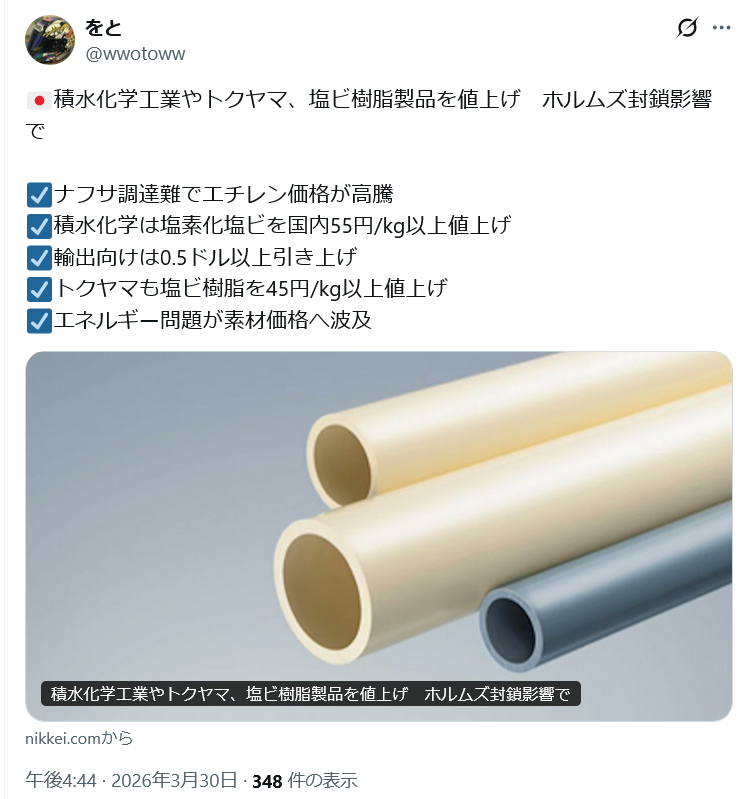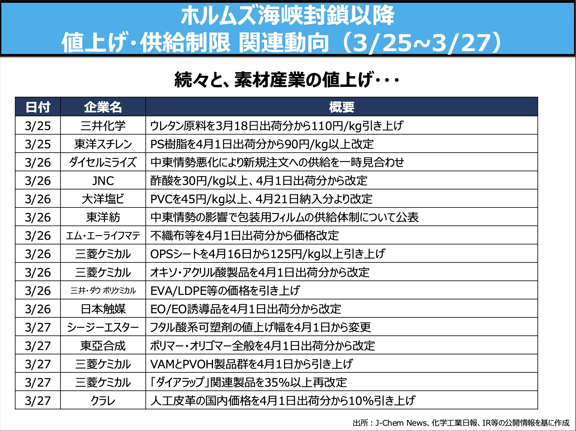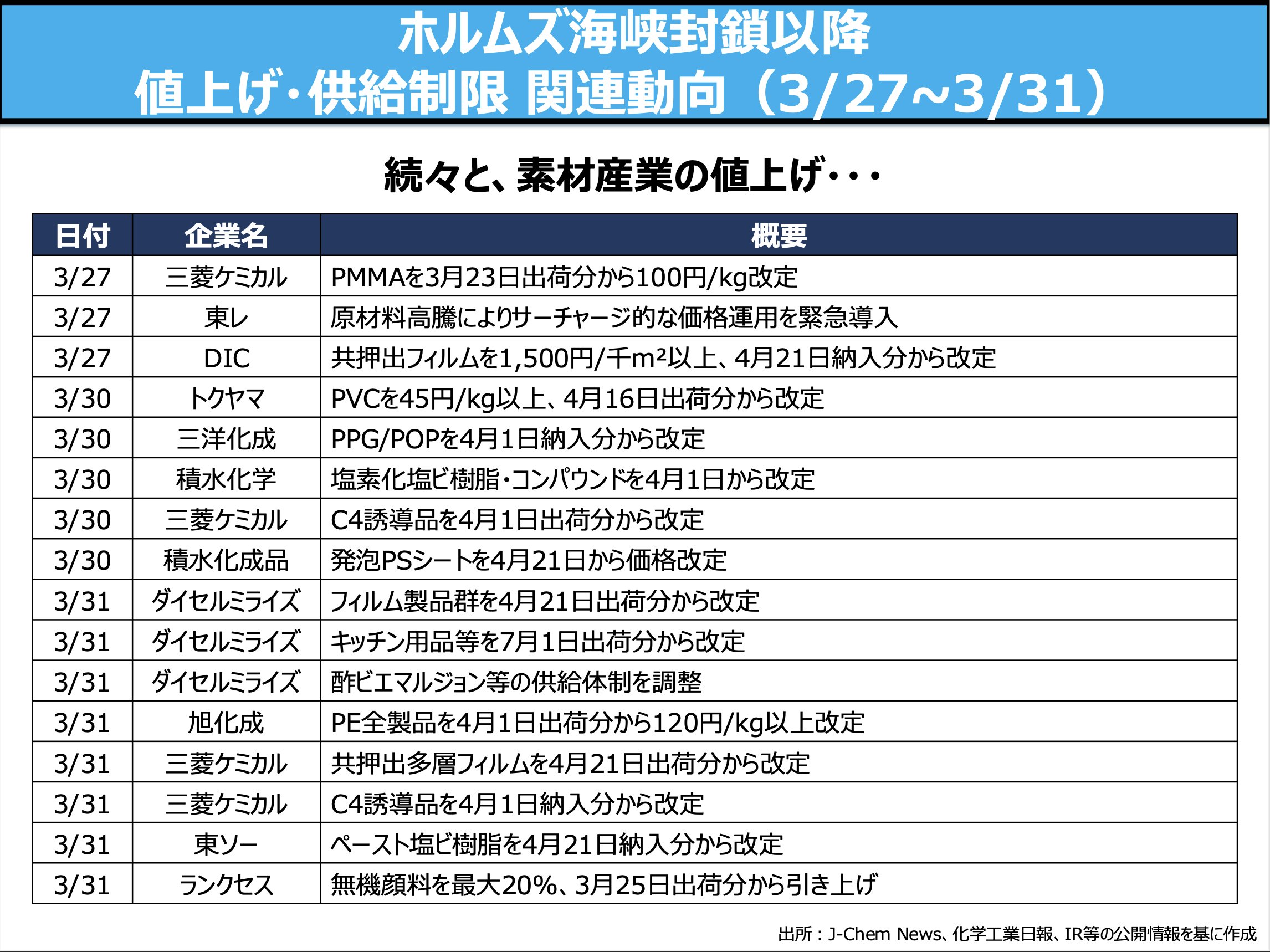 ホルムズ海峡の事実上の封鎖に伴う原料のナフサ(粗製ガソリン)の価格高騰などを反映する。
