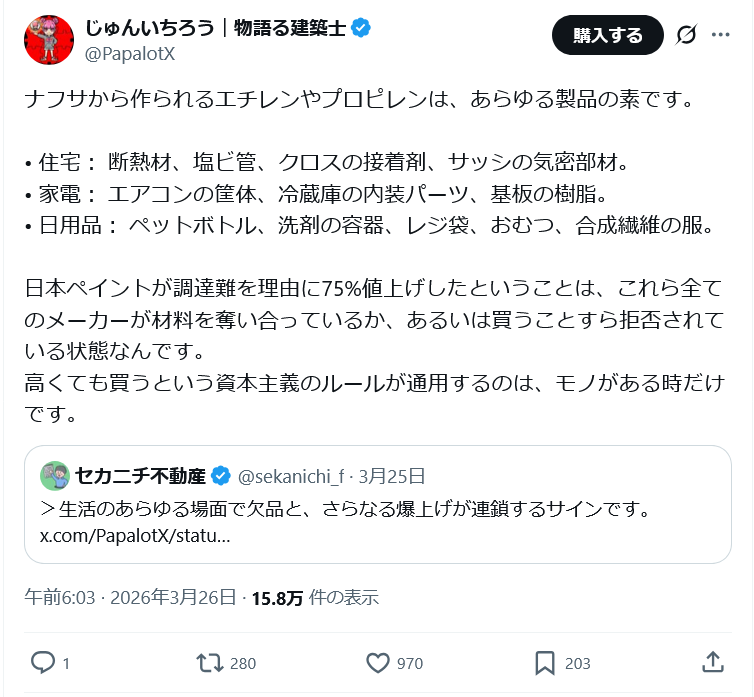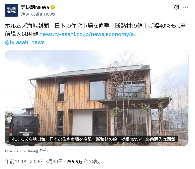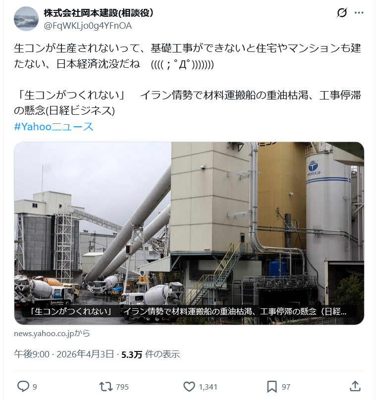 「生コンの供給網全体が油に縛られているため、物流の停滞が長引けば工期遅れに直結し、ただでさえ高騰している建設工事費がさらに跳ね上がる」と危惧する。