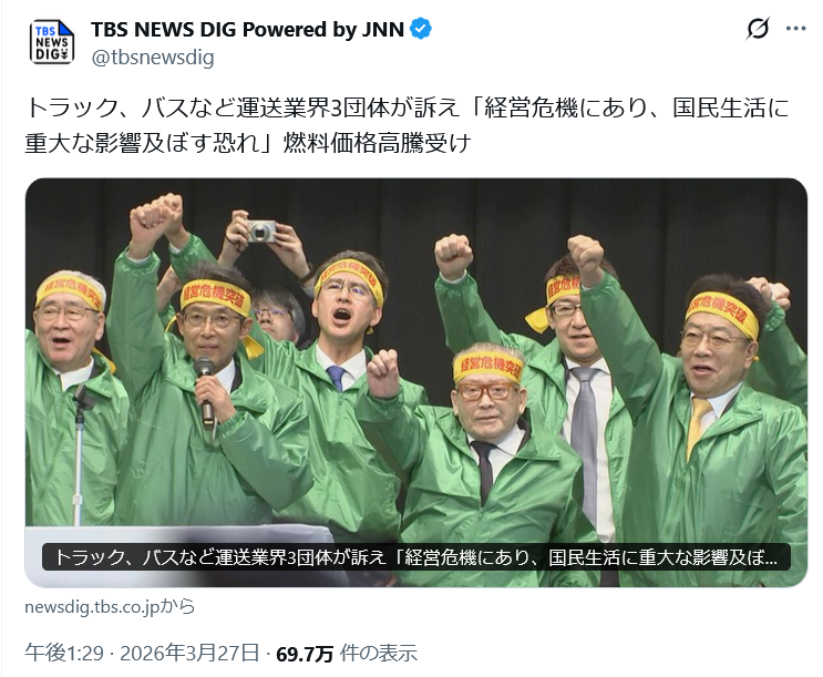 物流の業界団体でつくる日本物流団体連合会もこの日、声明を出した。燃料高騰に対し、業界の自助努力での対応には限界があるとして、運賃・料金改定への理解や、顧客の燃料節約意識の向上を求めた。
