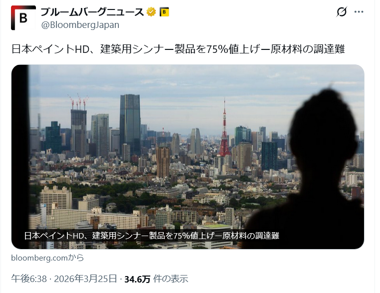 日本ペイントホールディングスの広報担当者は25日、子会社の日本ペイントが建築用シンナー製品の価格を19日発注分から75%値上げを実施したと明らかにした。