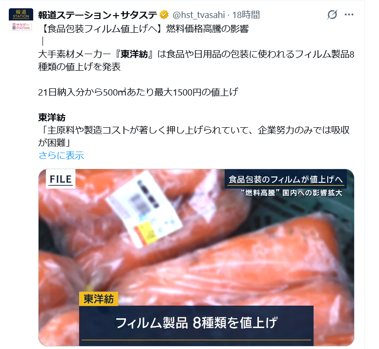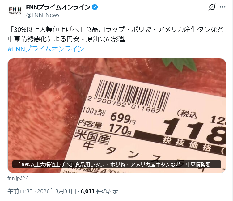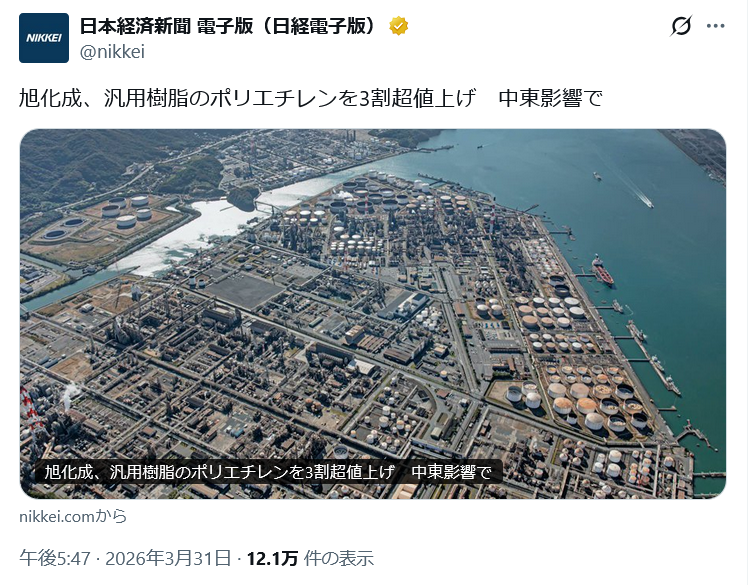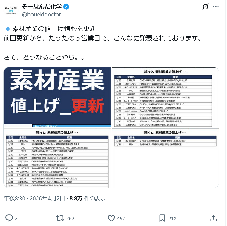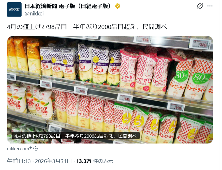 とりあえず、イラン戦争に関係なく、4月から値上げラッシュが実行されました。