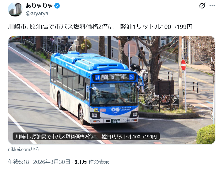 川崎市で4月1日から5月15日分の市バス燃料価格がほぼ2倍になった。