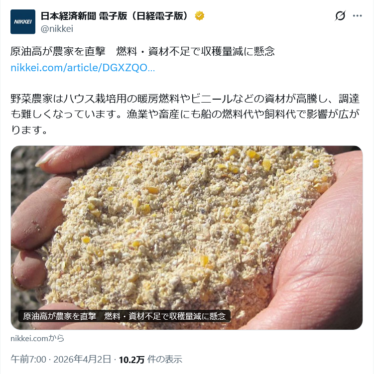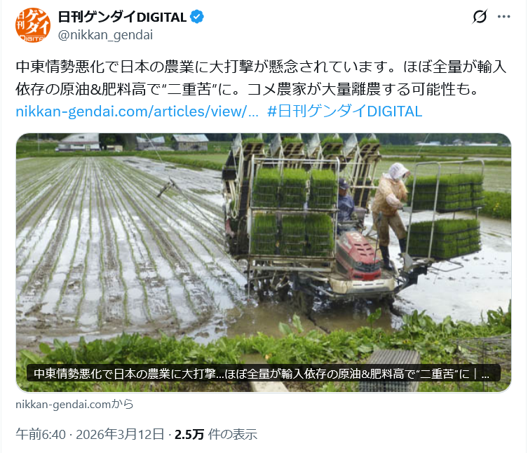 懸念はそれだけじゃない。JA全中の新会長に就任した神農佳人氏は6日の会見で、中東情勢を念頭に「これから農作業が本格化する時期で、当然、燃料も使うし、農業資材も用いるわけで、肥料農薬から農業機械まで本当に心配をしている」と、危機感を示した。