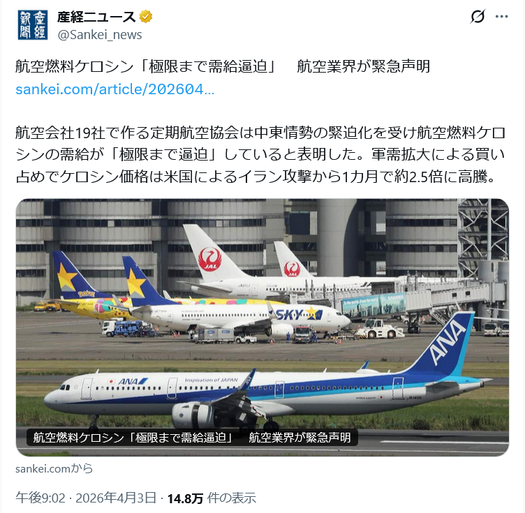 航空会社19社で作る定期航空協会は3日、中東情勢の緊迫化を受け航空燃料ケロシンの需給が「極限まで逼迫」していると表明した。軍需拡大による買い占めで、ケロシン価格は米国によるイラン攻撃から1カ月で約2・5倍に高騰。事態が長引けば、業界全体で年数千億円以上の負担増となりかねないという。