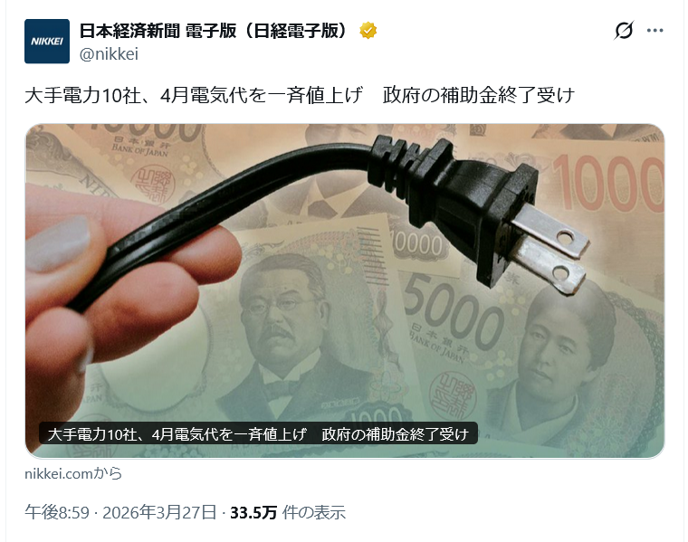 電力ガスは、イラン戦争関係なく、政府の補助金が終了したことから
