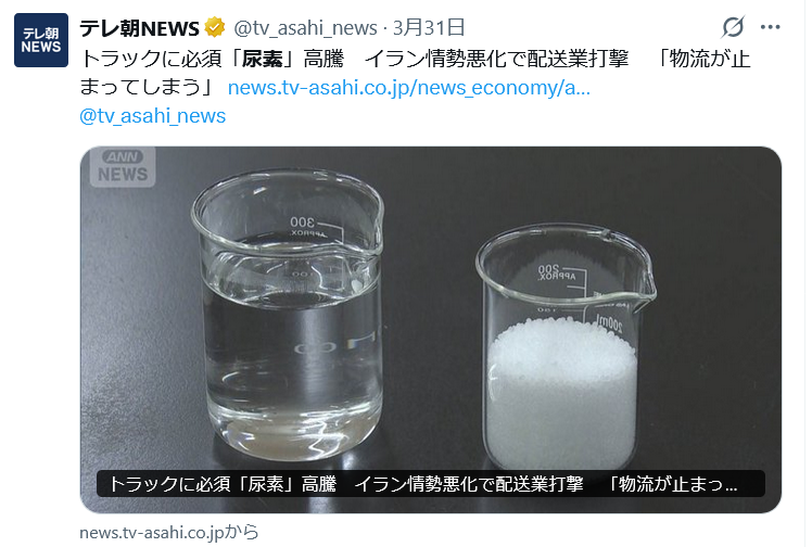 イラン情勢を受けて、トラックのエンジンなどで必要な「尿素」の価格も高騰しています。物流業界にも供給への懸念の声が広がっています。