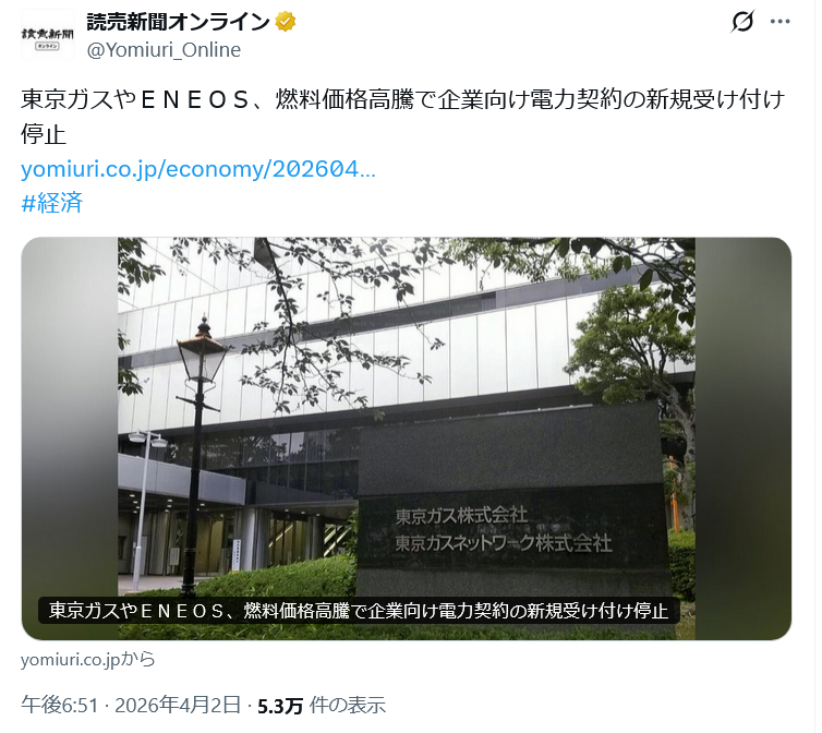 中東情勢に伴う燃料価格の高騰を受け、東京ガスやENEOSホールディングス(HD)は、工場や商業施設を対象とした企業向け電力小売り契約の新規受け付け停止を決めた。家庭向けの受け付けは続ける。