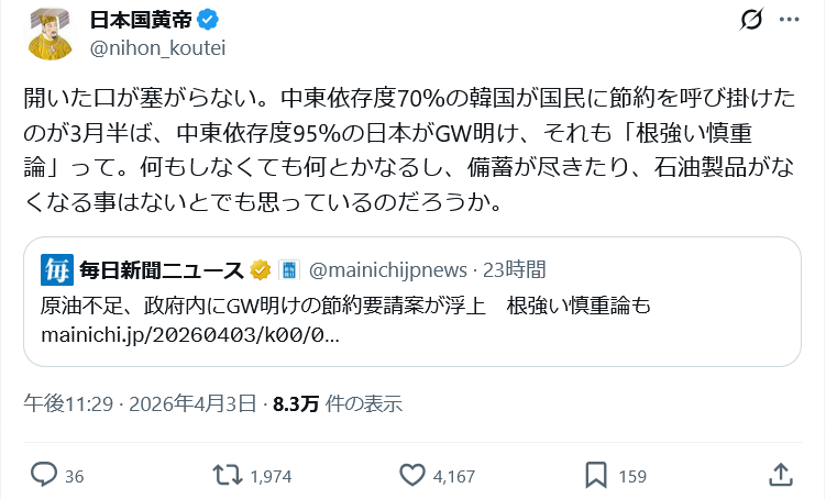 「節約」の要請をGW明けにすることを検討中だそうです(唖然)